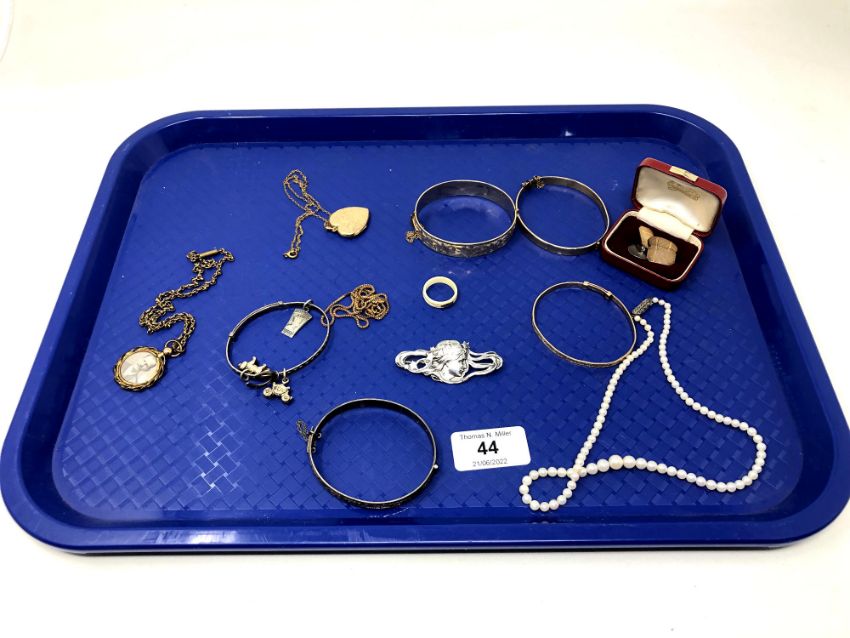 A quantity of Victorian and later jewellery including gold plated bangles, pearl necklace, gilt metal locket and chains, two silver bangles etc (one tray)
