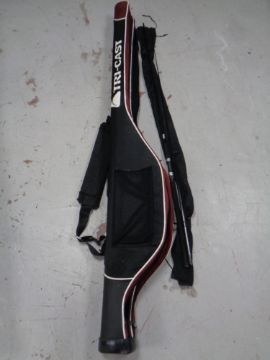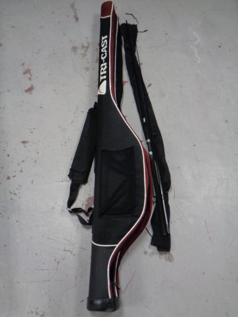 A Tri-cast cocoon double holdall fishing rod bag containing fishing umbrella, extension pole, a badger landing net