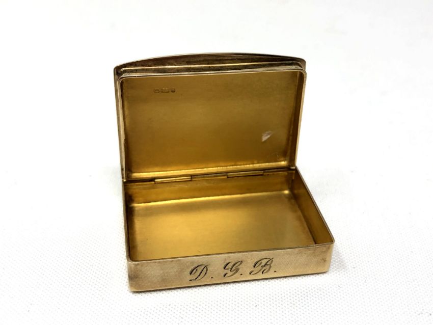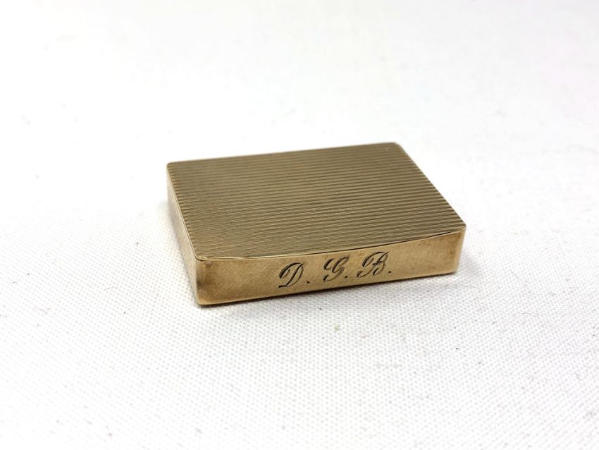 A 9ct gold pill box, engraved with initials DGB, width 39mm.