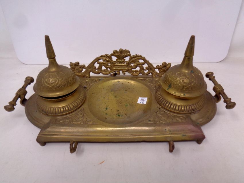 A decorative brass twin inkwell desk stand