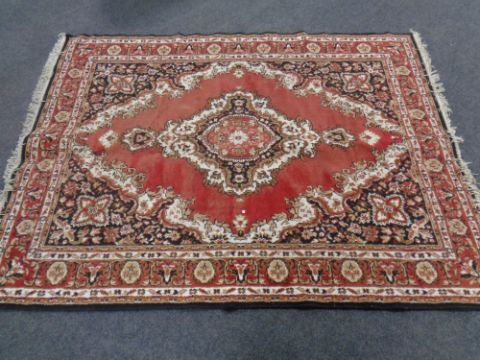 A fringed Iranian woolen rug of geometric design on black and red ground
