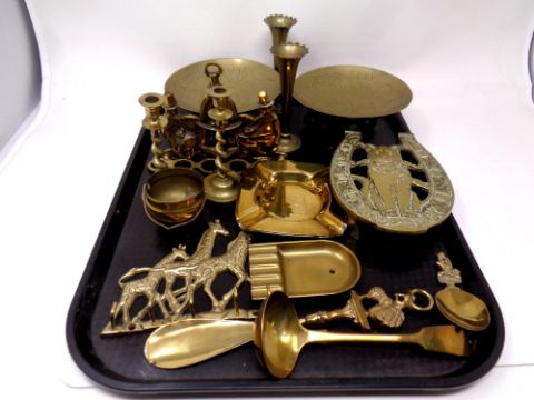 A tray containing antique and later brass ware to include candlesticks, a pair of eastern bowls on stands, trivet, shoe horn, ashtrays etc