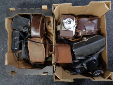 Two boxes containing vintage cameras and cine cameras