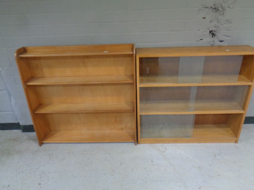 A set of mid 20th century sliding glass door bookshelves together with a further set of open bookshelves.
