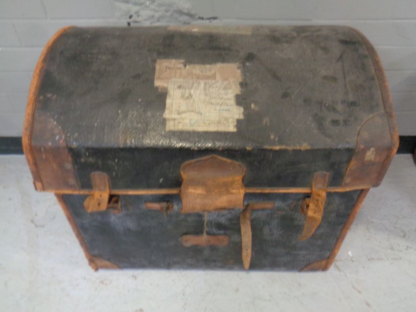 An antique leather bound dome topped trunk bearing railway luggage labels.