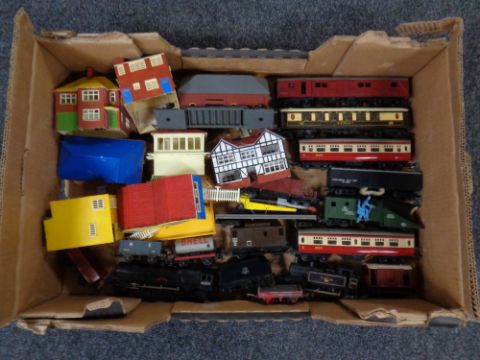 A box containing a quantity of Triang 00 scale rolling stock to include engines, tenders, coaches, wagons together with a quantity of plastic railway buildings.