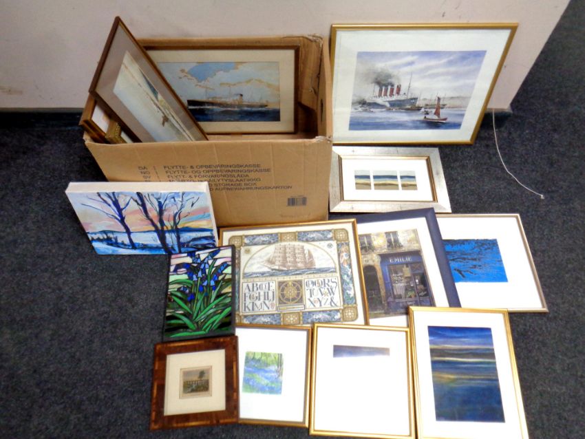 A box containing a large quantity of pictures and prints, framed photographs, needlework panels, signed prints