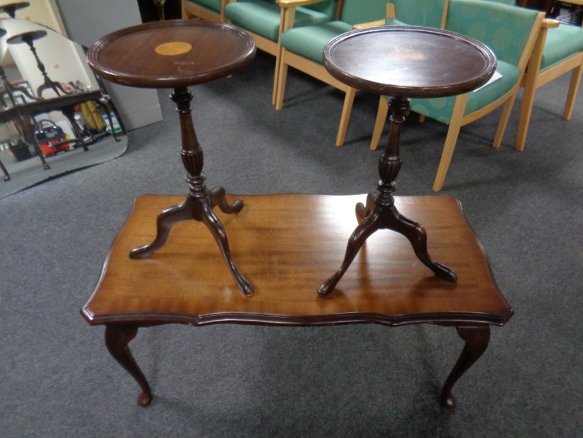 A pair of inlaid mahogany wine tables together with a shaped coffee table in a mahogany finish
