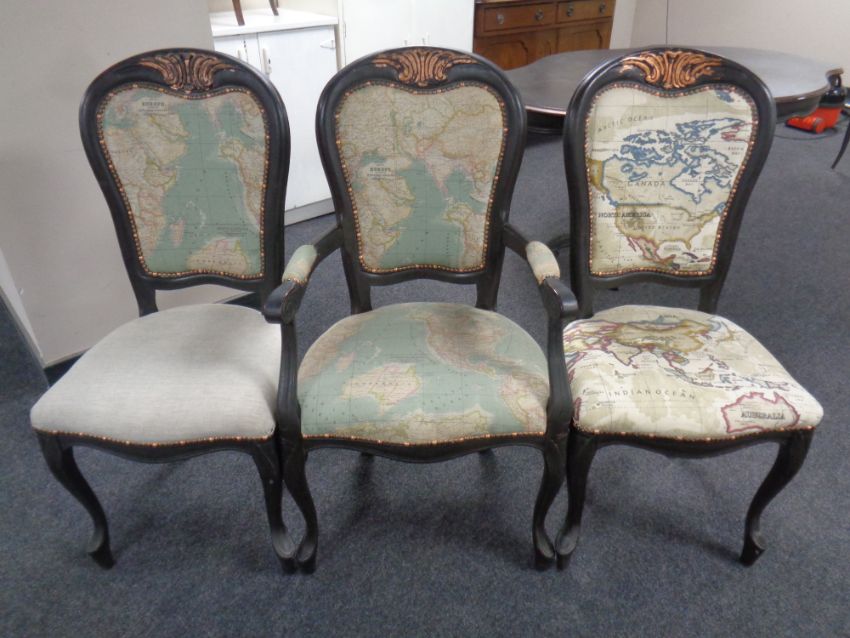 An Italian style shaped pedestal dining table together with a set of six chairs upholstered in map of the world fabric