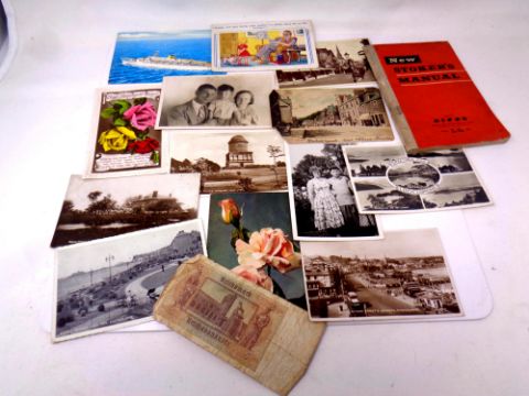 A metal concertina tool box containing assorted books together with a quantity of paper ephemera to include German banknotes, postcards, soldier service pay book, mine worker's pension book, post office savings books, ration books etc