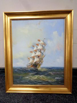 A oil on canvas of a Tall ship at full sail, indistinctively signed in a gilt frame