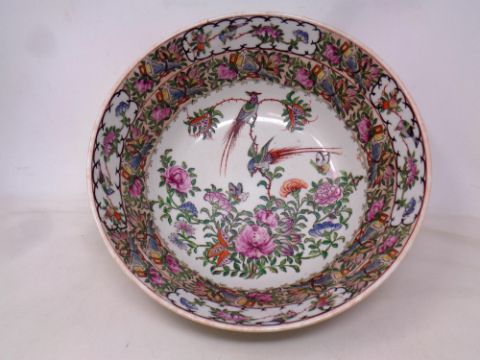 A 20th century Cantonese porcelain pink rose patterned bowl, diameter 31 cm, character marks to base.