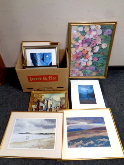 A box containing a large quantity of pictures and prints to include signed photographs, signed print of Dunstanburgh castle, oil on canvas street scene etc