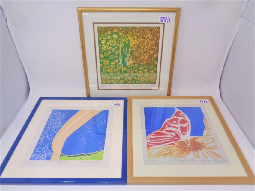 Alan Barnfather : Skyline, woodcut in colours, numbered 1/15, signed in pencil, dated '12, gallery label verso, 20 cm x 20 cm, together with two further signed woodcuts by the same artist, all three parts framed. (3)