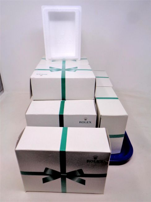 Ten Rolex display boxes with internal polystyrene box, both bearing Rolex branding.