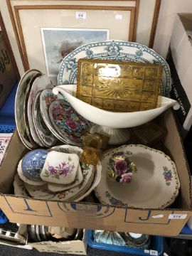 A box containing assorted antique and later ceramics together with a four piece amber glass trinket set