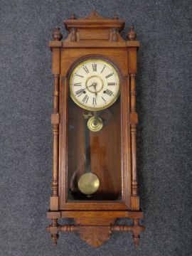 An Edwardian carved oak eight day wall clock with pendulum