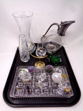 A tray containing glass and silver plate mounted claret jug, cut glass vase, cut glass tray, glass ornaments, swarovski etc
