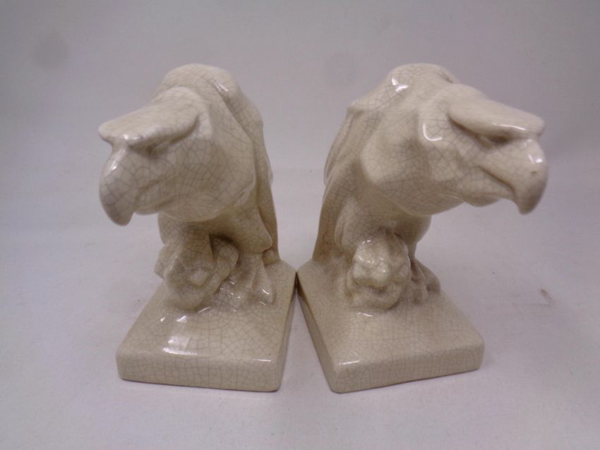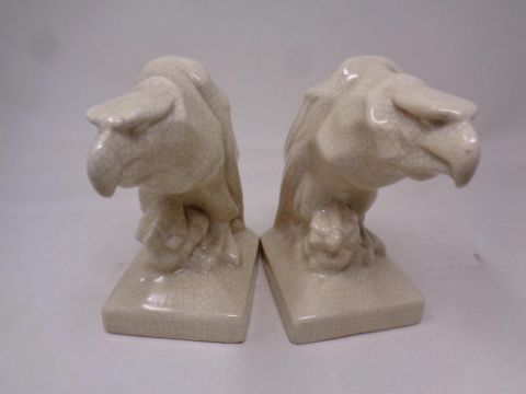 A pair of crackle glaze pottery eagle head book ends