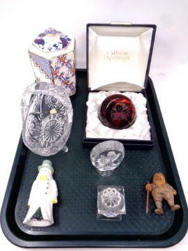 A tray containing boxed Caithness paperweight, Mason's Appliqué hexagonal lidded pot, Royal Worcester figure 'Budge' etc