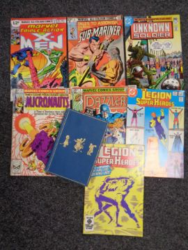 Vintage 1926 hardback book edition of A A Milne's When We Were Very Young with pictorial images along with vintage DC and Marvel comics to include: Fantastic Four, The Legion of Super Heroes, Submariner, The Unknown Soldier and others.