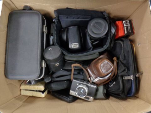 A box containing a quantity of assorted cameras, camera bags and lenses to include a Cannon EOS850