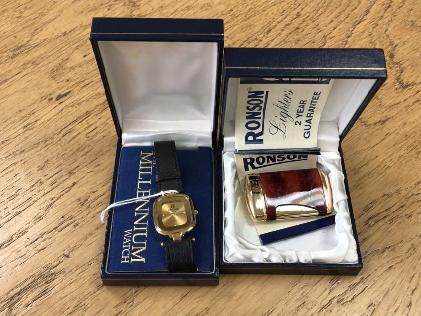 A Ronson gilt and tortoiseshell-effect cigarette lighter (boxed), together with a Raymond gold plated "Millenium" wristwatch and a Harrods vinyl shopping bag. (3)