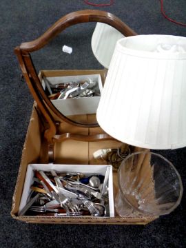 A box containing 19th century mahogany shield framed mirror on stand, brass table lamp with shade, cut glass vase together with a large quantity of stainless steel cutlery