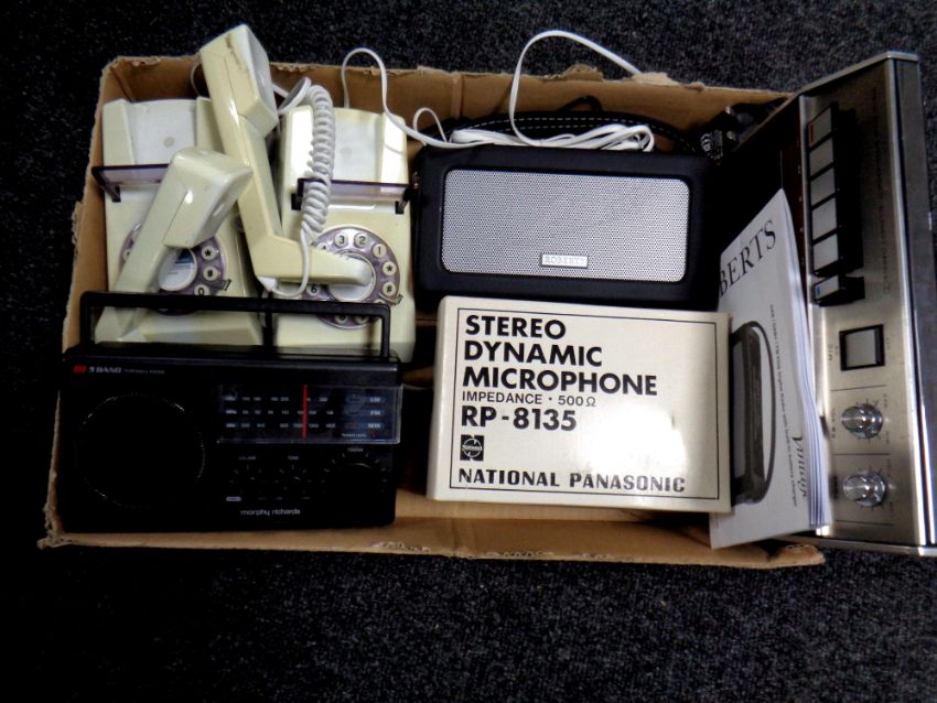 A Pfaff synchromatic 1217 electric sewing machine with foot pedal together with a box of assorted electricals including telephones, radio, Sony cassette deck etc