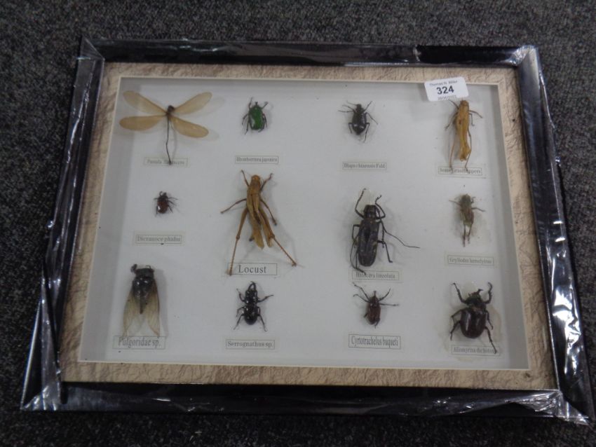 Tropical display of 12 large insects to include the Batocera lineolata, Allomyrina dichotoma, Dicranoce phatu and blaps chinensis fald.
