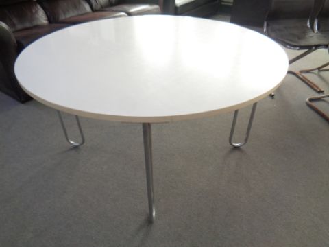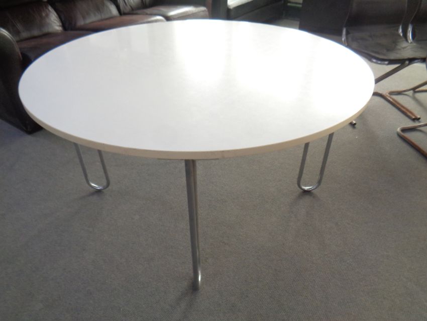 A mid 20th century Dux circular dining table on metal legs together with a set of five tubular metal dining chairs upholstered in black fabric