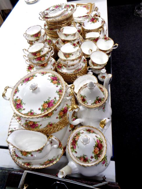 One hundred and sixteen pieces of Royal Albert Old Country Roses tea and dinner china, cake plates, cake stand together with a matching table cloth and napkins