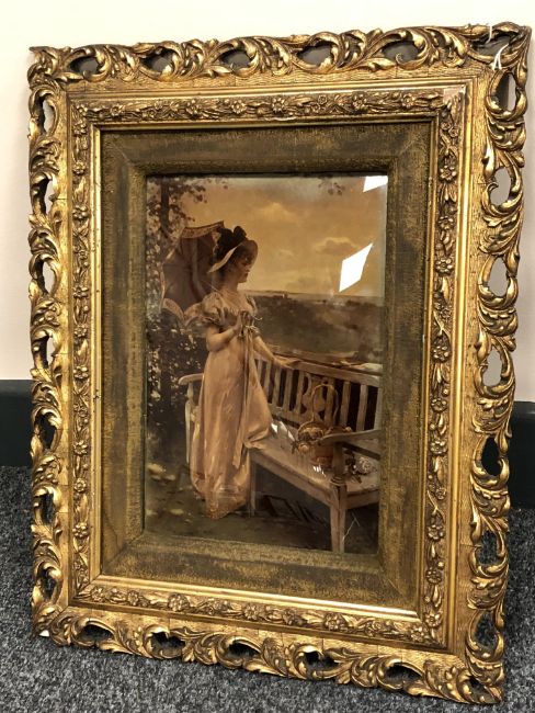A crystoleum of a Lady Holding a Parasol Standing Next to a Bench, 25 cm x 16 cm, framed.
