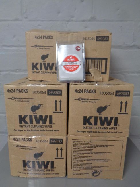 Five boxes containing Kiwi instant cleaning wipes