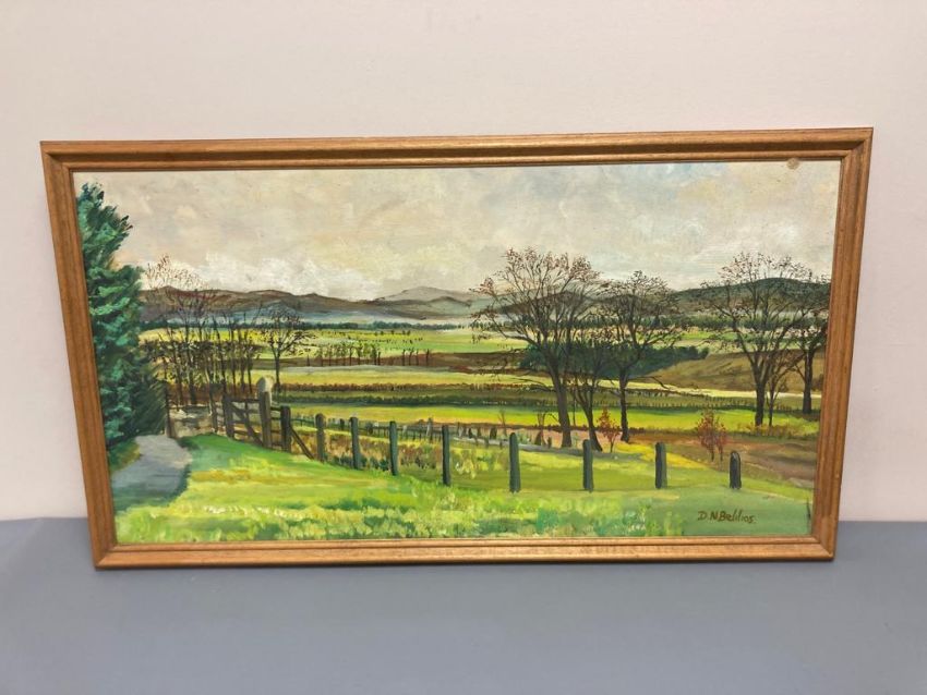 David Belilios : Farm landscape, oil on board, signed, 85 cm x 44 cm.