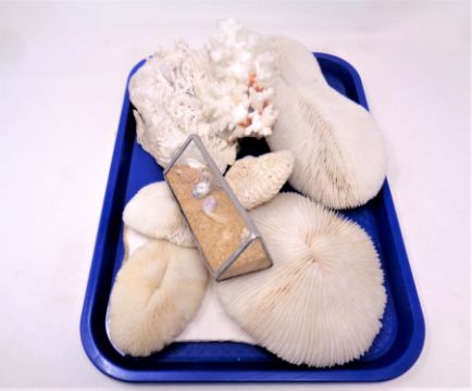 A tray containing a quantity of coral and shell specimens