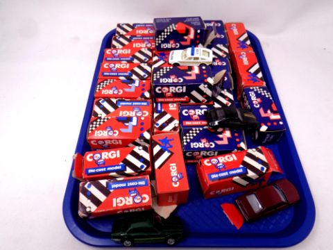 A tray containing twenty-seven 1980's boxed Corgi cars to include Police Rover, Transit Wrecker, Pontiac Firebird, Renault 5 etc