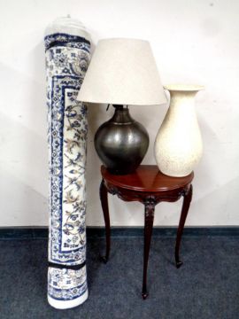 A Next woolen rug together with a demi-lune hall table in a mahogany finish, a metal table lamp with shade and a pottery vase
