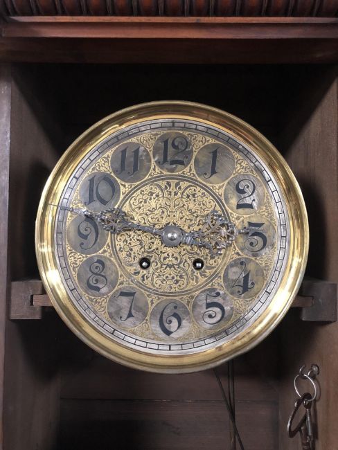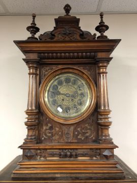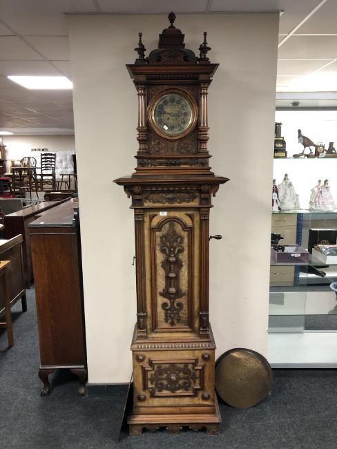 A 19th Century German Oak and Burr Walnut Symphonion or Polyphon Disc Player/Clock, the 81/2" dial with Arabic numerals and outer minute track, striking on a gong, architectural case with pagoda pediment and turned finials, burr walnut central door with applied fretwork carving and moulded central pilasters, egg and dart moulded lower case with carved frieze beneath, inner door and hood stamped Made in Germany, winding handle to right side of case, with thirteen 13" discs, 233cm high by 59.5cm wide by 37cm deep.