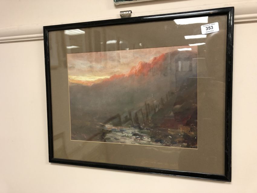 John Falconar Slater (1857 - 1937) : River Valley at Sunset, oil on board, signed, 25 cm x 35 cm, framed.