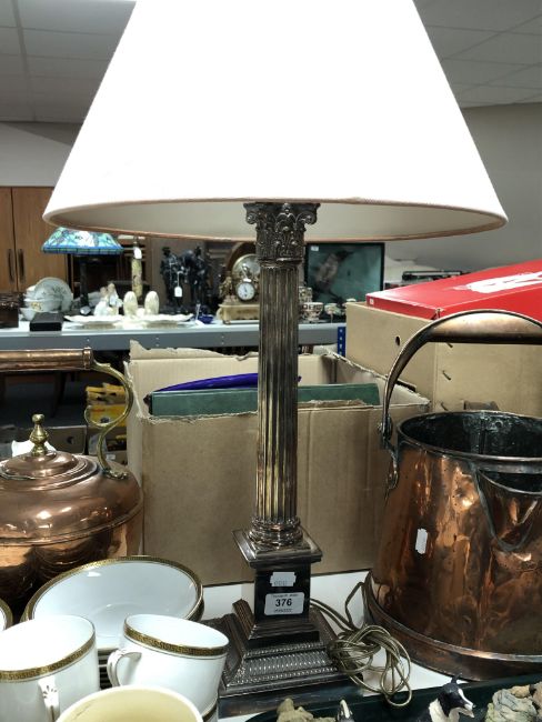 A silver plated Corinthian column table lamp with shade