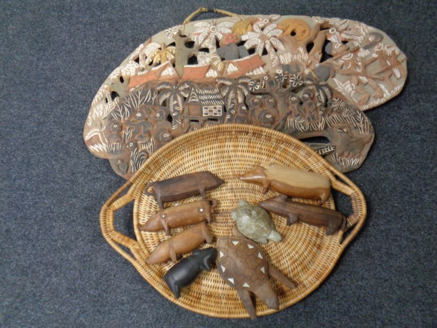A crate containing a wicker twin handled serving tray, tourist carvings and animal figures, story boards