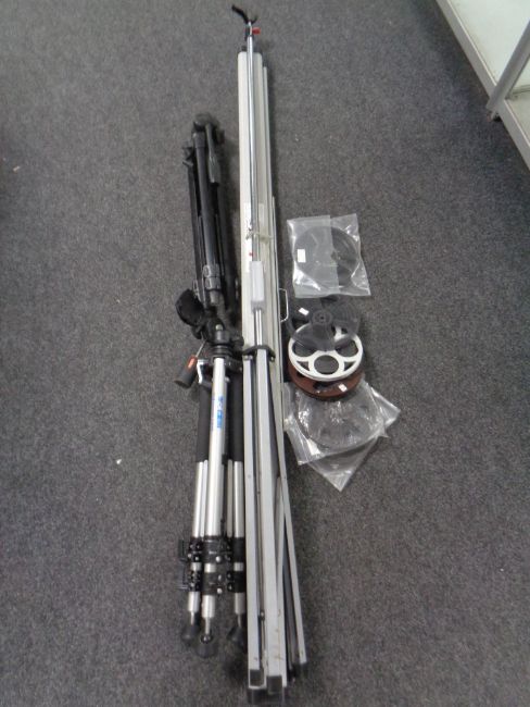 A Photax projector screen together with two camera tripods and a crate containing film reels to include one labeled 1951 cup final, Newcastle V Blackpool