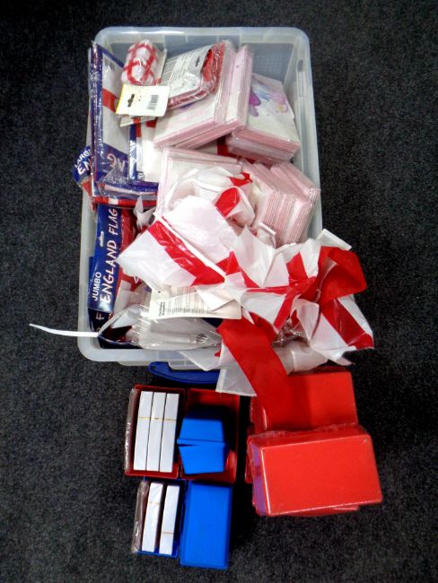 A box containing jumbo England flags, greetings cards together with a further box containing index cards in boxes