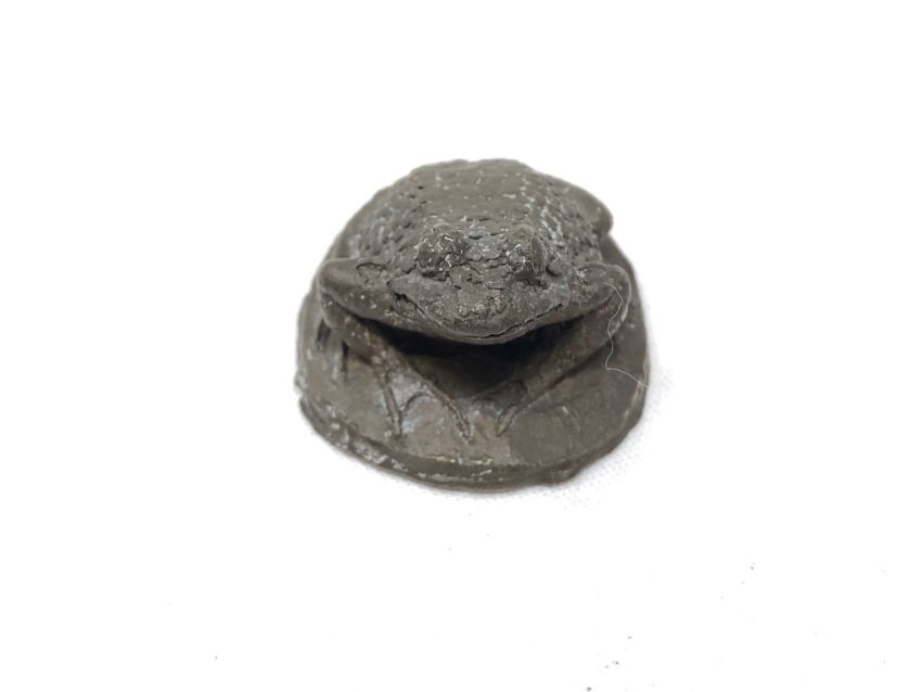 A bronze miniature figure of a toad, approximately 35 mm in diameter.