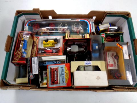 A box containing a large quantity of die cast vehicles to include Corgi Classics, Corgi silver jubilee state carriage, Matchbox Models of Yesteryear Lledo Days Gone etc