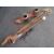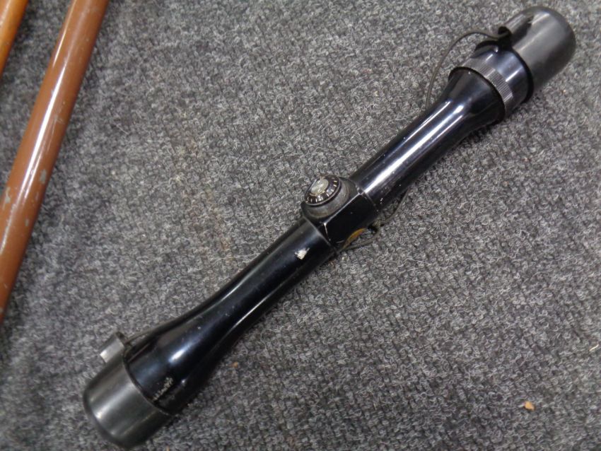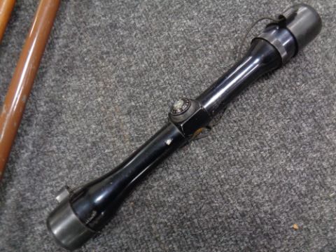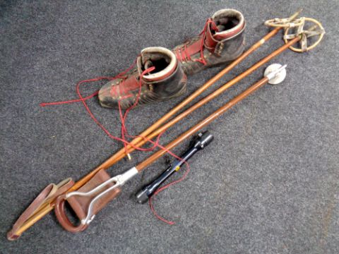 A pair of vintage bamboo ski poles, a pair of ski boots, a shooting stick and a gun sight