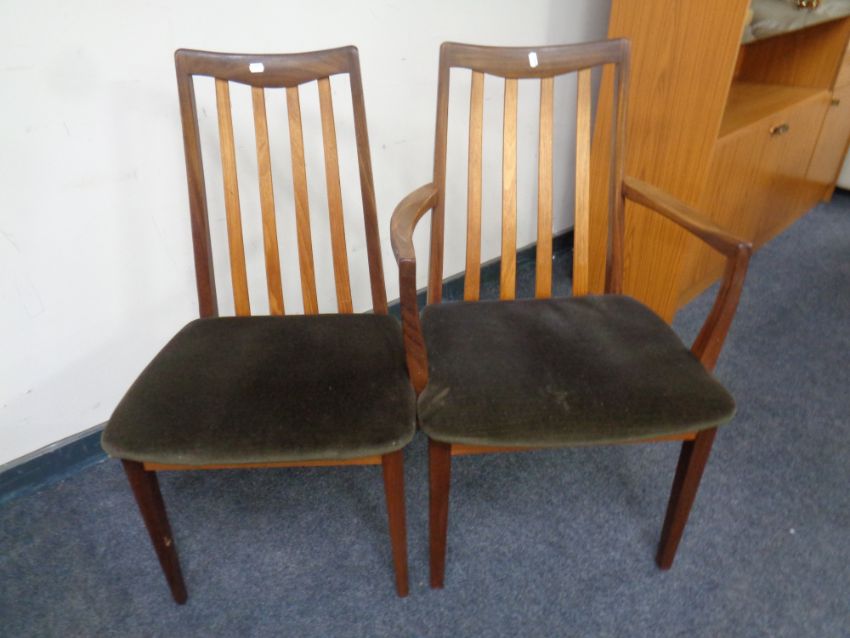 A mid 20th century oval teak G plan extending dining table together with a set of six rail back chairs comprising of two carvers, four singles