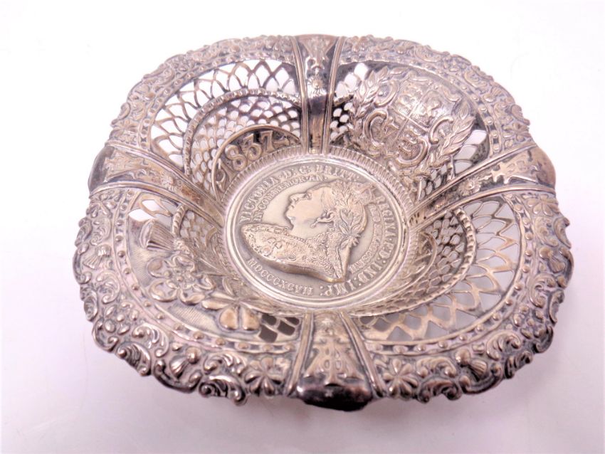 A pierced silver dish inset with a medallion commemorating Queen Victorias Golden Jubilee
