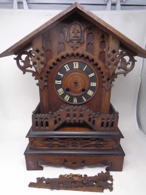 A 19th century heavily carved pine Gothic cuckoo clock (as found)